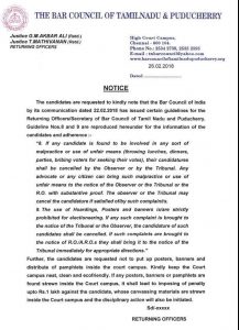 The elections of the Bar Council of Tami Nadu scheduled to be held on 28th March, 2018. Earlier, Justice Akbar Ali appointed as Returning Officer and thereafter, Justice T.Mathivanan has also been appointed as Additional Returning Officer. Bar Council of India framed certain guidelines for regulating the Election. Now the Returning Officers pointed out that the candidature shall liable to be cancelled, in case the candidates violate any of the guidelines issued by Bar Council of India or any malpractice or using any unfair means. Placing Banners, posters, pamphlets for canvassing is banned. Particularly, circulating of pamphlets inside the Court Campus will attract a fine to the maximum of Rs.1 Lakh.